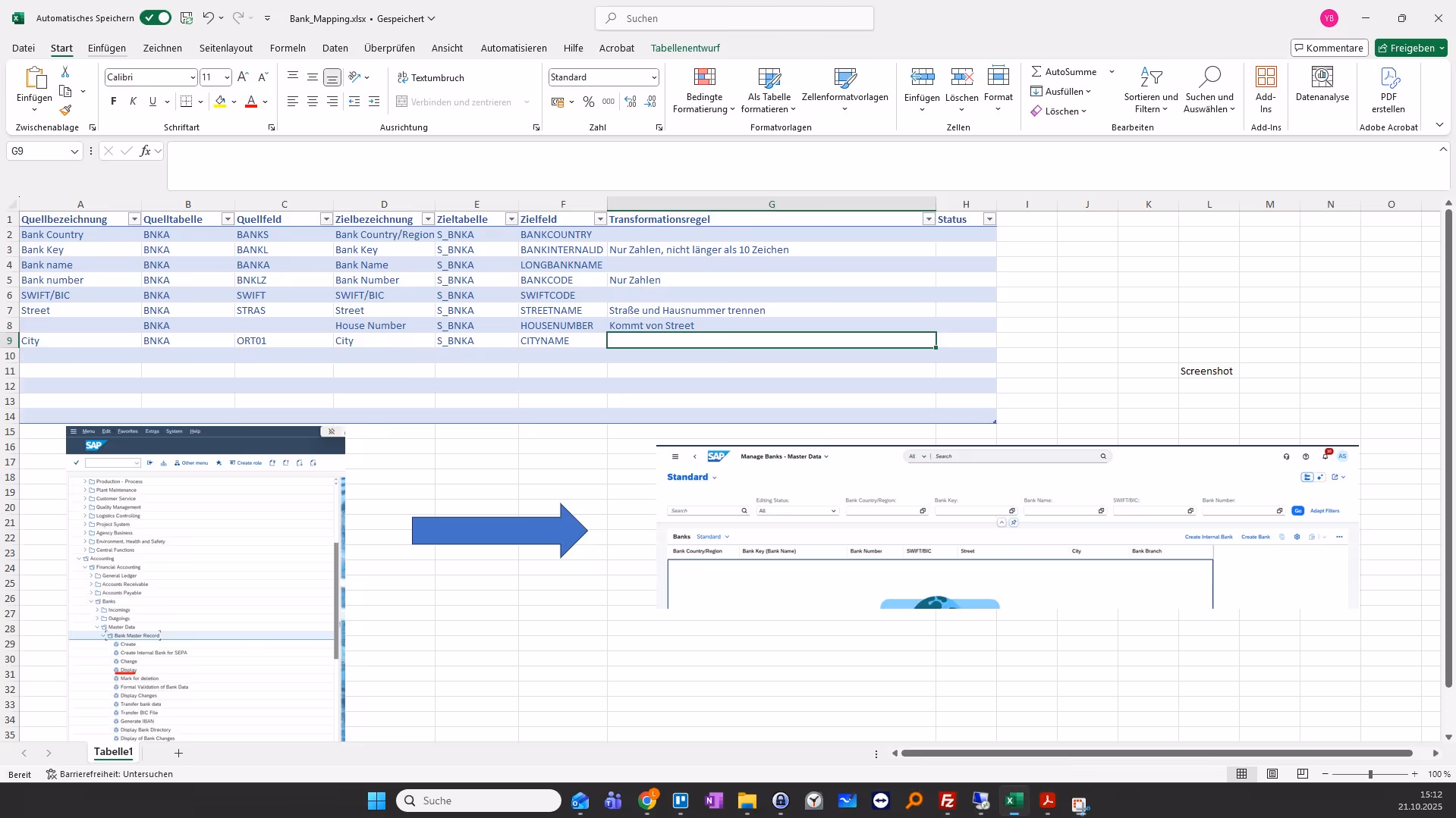 Gemeinsam mit den Fachabteilungen und SAP-Beratern erarbeiten wir in Workshops, welche Felder im Zielsystem benötigt werden und welche im Quellsystem vorhanden sind. Wir prüfen Feldlängen, Formate, Datenqualität und mögliche Transformationsregeln. Diese Erkenntnisse dokumentiere ich sauber – mit Screenshots, Tabellen und konkreten To-Dos.